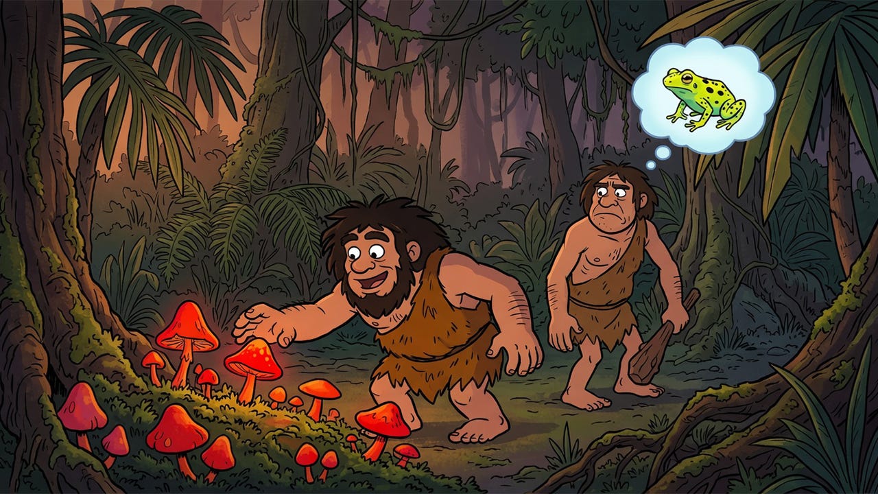 Lucius: Sure. Imagine two early humans—call them Bam Bam and Bom Bom—standing in front of a brightly colored mushroom. Bam Bam looks at it and thinks, beautiful colors, must be good to eat. He has no prior experience with brightly colored things, so he pops it in his mouth and dies within minutes.
