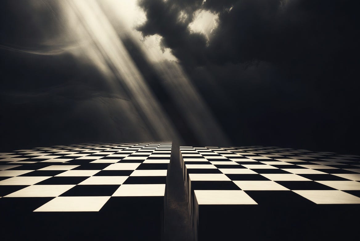 To illustrate the absurdity of the political struggle—the belief that you can defeat the other side—imagine a chessboard. Two opposing teams: white and black. Each team can take turns defeating the other, but neither ever defeats the game of chess itself. If white were to remove all of black’s pieces, the identity of white would become meaningless. It would have no one to oppose. The game would not be possible. White has no one to defeat, no value, no role, no purpose.